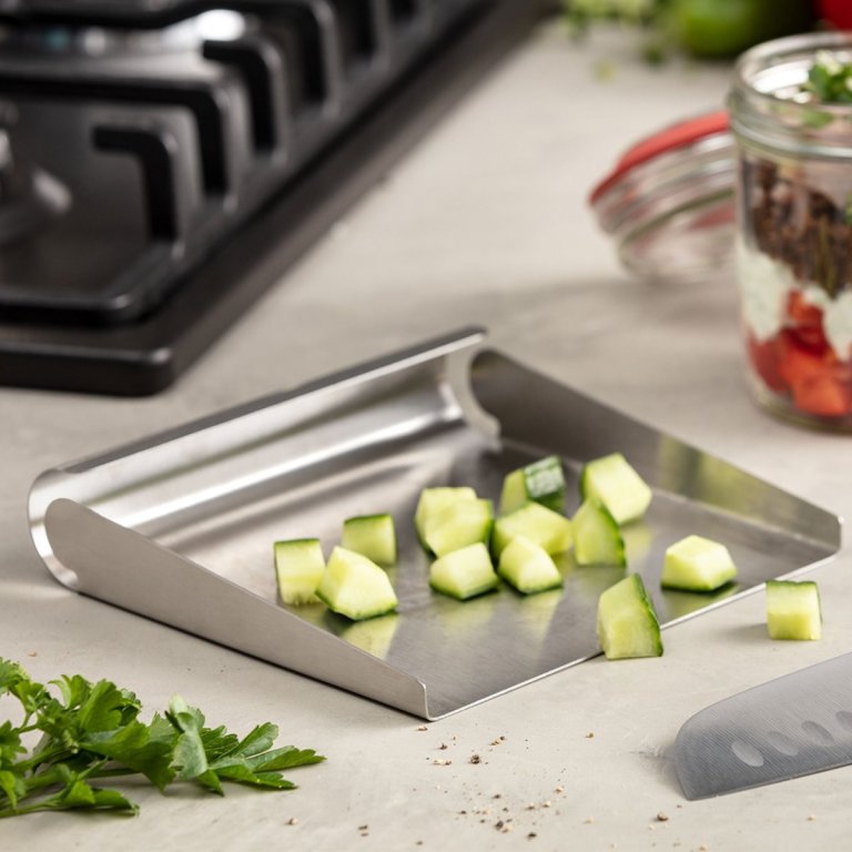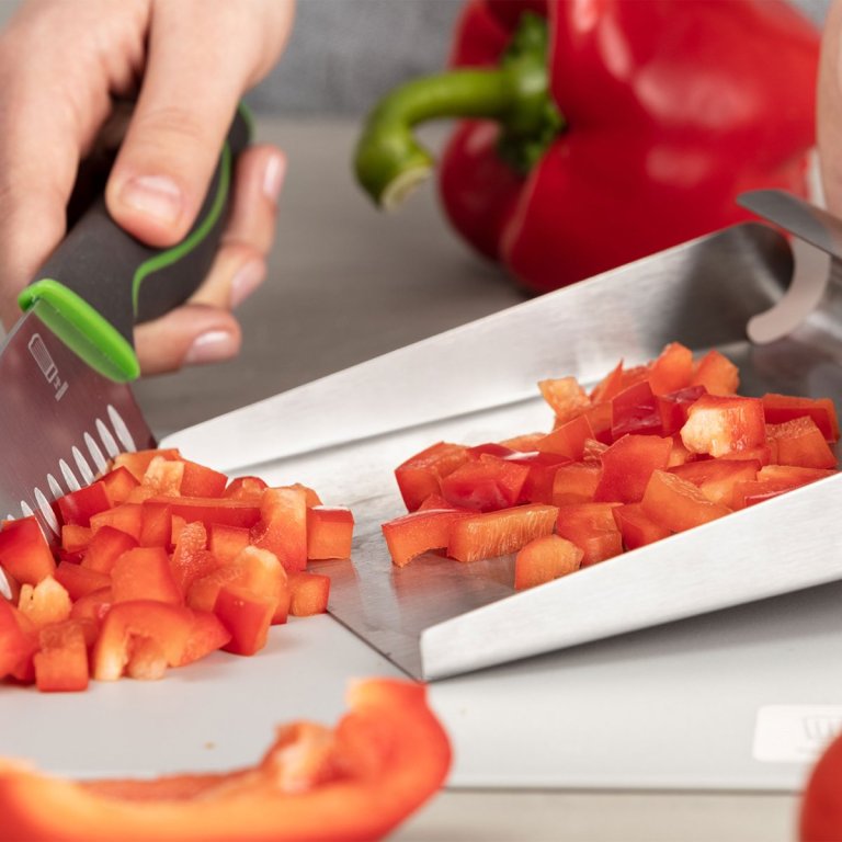 A praktikusan megemelt élek biztosítják, hogy a hozzávalókat biztonságosan szállítsa a vágódeszkáról az edénybe vagy serpenyőbe