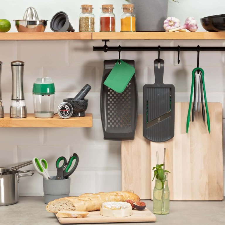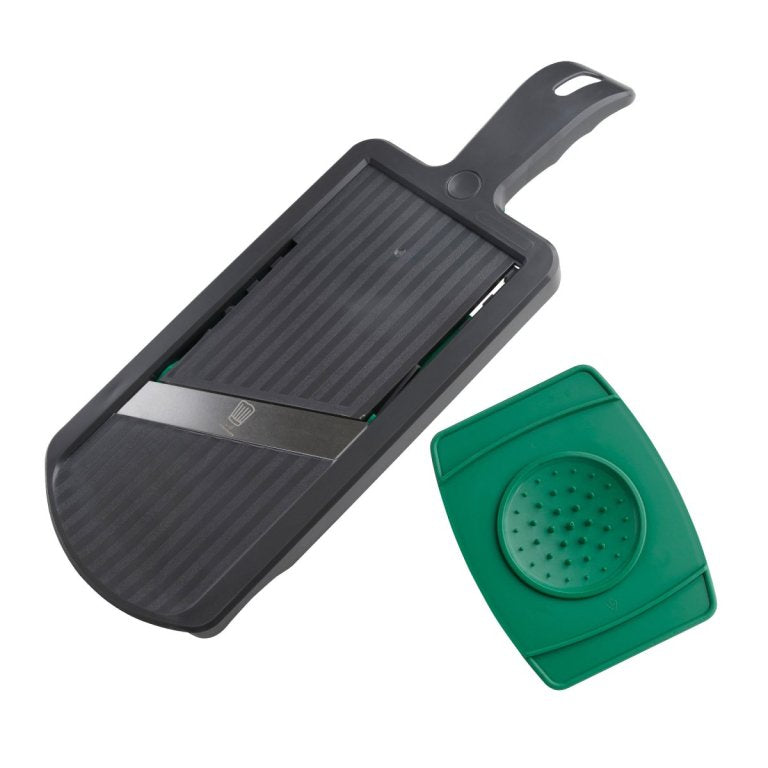 Műanyag zöldségszeletelő rozsdamentes acél pengékkel, időtlen szürke színben, zöld díszítéssel - méretek 29 x 13 cm