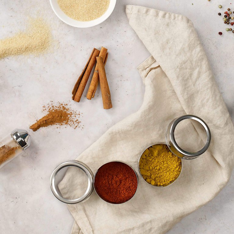 4 fűszertartó dobozt tartalmaz, mérete Ø 6,3 x 4,5 cm