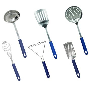A szett tartalma: burgonyatörő, szűrőkanál, merőkanál, reszelő, habverő, serpenyőlapát