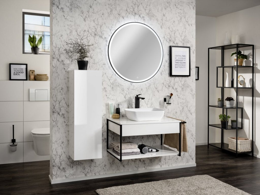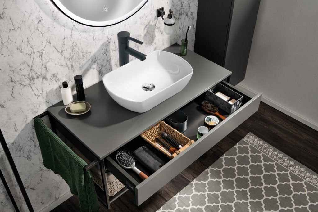 Az OXFORD sorozat fekete struktúrált munkalapjához a mosdó vakító fehér felülete kiemelkedik. A 83312 és 83317 cikkszámú mosdóalsószekrény kombinálható a 60-150 cm közötti szélességű munkalappal (83301-302-304-305).
