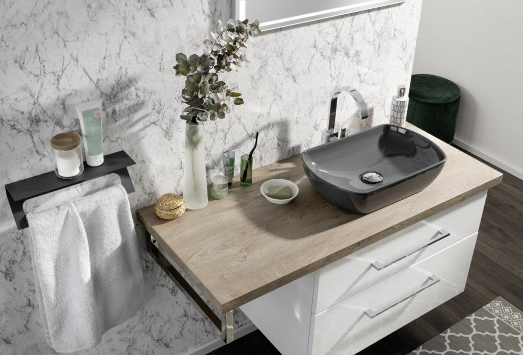 Az OXFORD sorozat fekete struktúrált munkalapjához harmonikusan illeszkedik a mosdó szürke felülete. A 83312 és 83317 cikkszámú mosdóalsószekrény kombinálható a 60-150 cm közötti szélességű munkalappal (83301-302-304-305).
