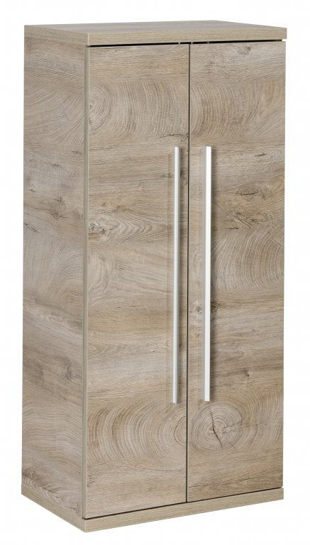 A Fackelmann midi szekrény két natur tölgy ajtóval és azonos színű korpusszal minden fürdőszoba extravagáns fénypontja. A matt alumínium fogantyú még inkább kiemeli a bútort.