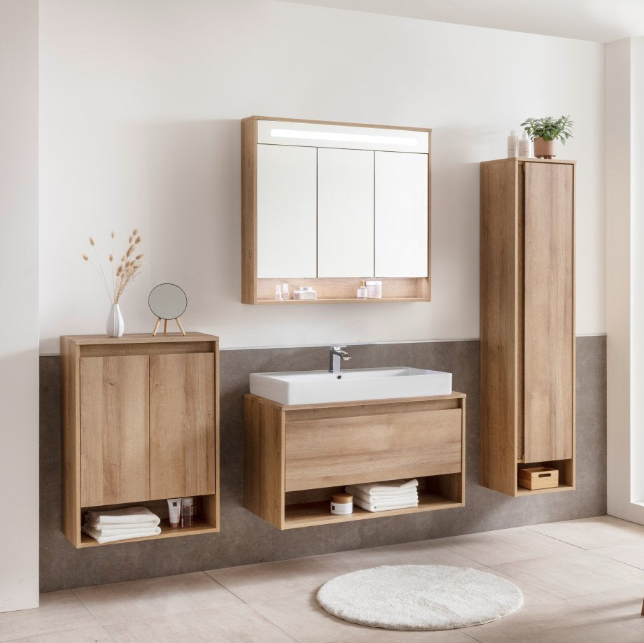 Nagyméretű, sok részlettel rendelkező tükrös szekrényt keres, amely a legmodernebb? Ezt kínálja Önnek a Fackelmann NATURA sorozatába tartozó LED-es tükörszekrény 93 cm szélességgel.