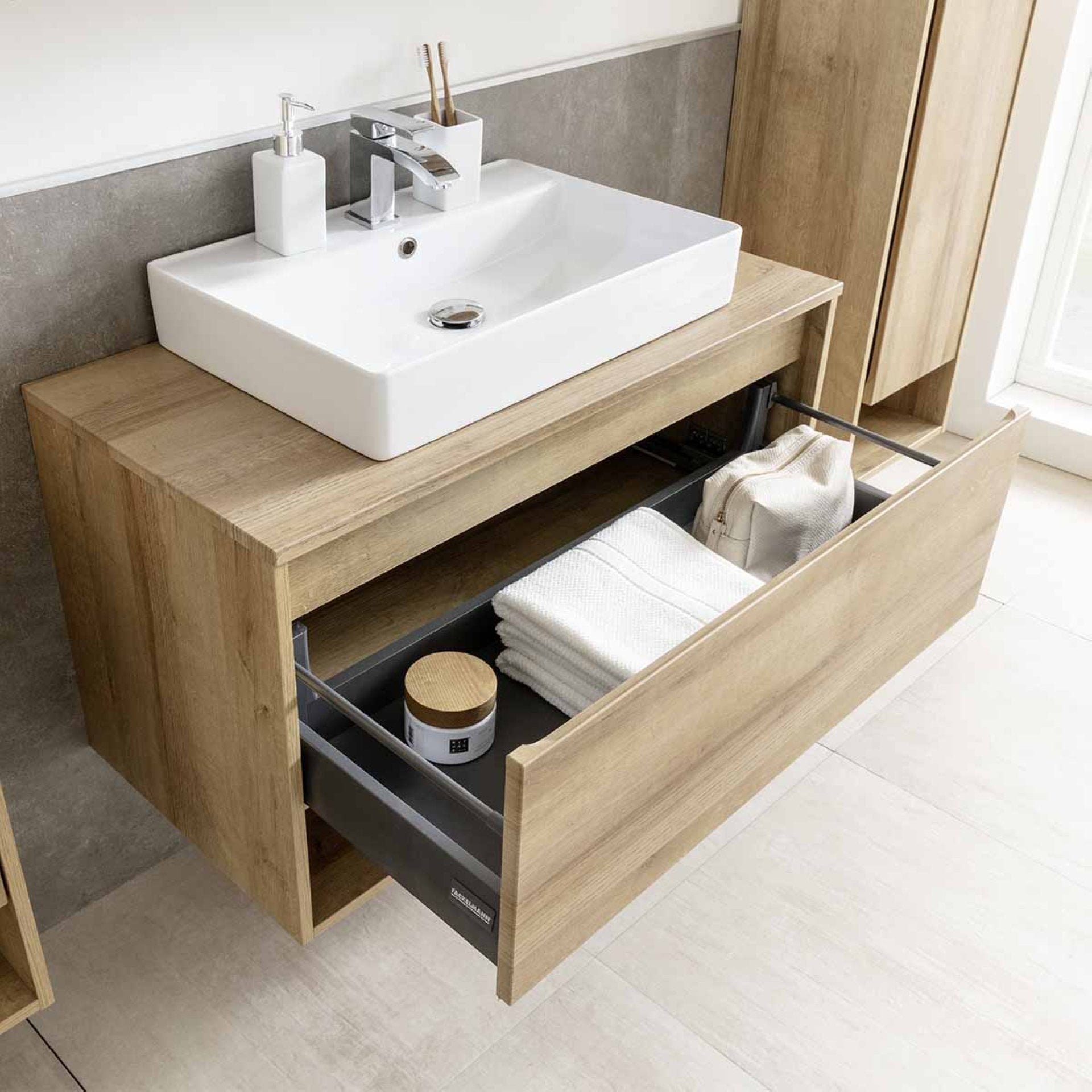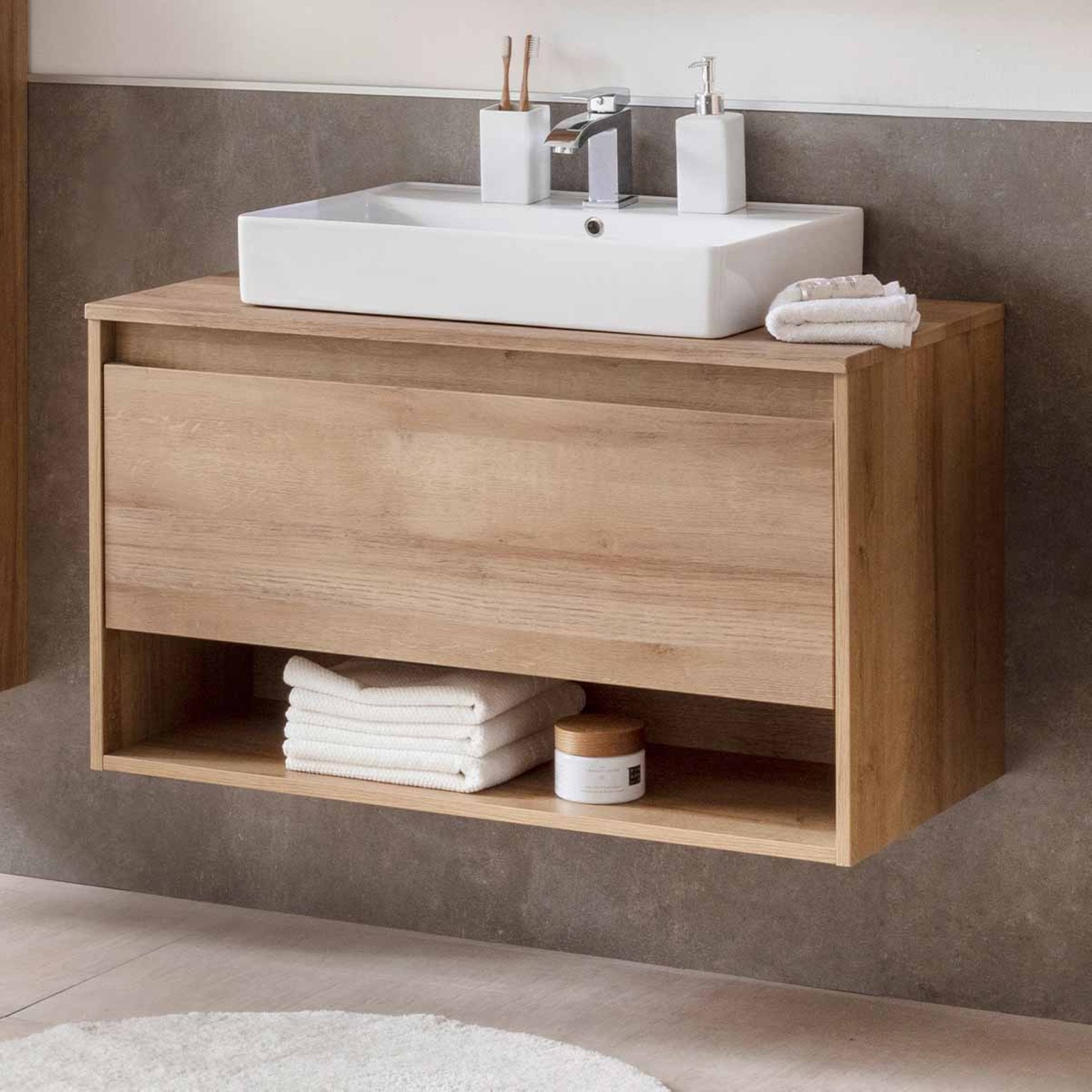 A Fackelmann NATURA sorozat lenyűgöz egyedi megjelenésével. A természetes kialakítású fürdőszobabútor a jelenlegi trend a fürdőszobában. A nagy fiók elegendő tárolóhelyet biztosít a fürdőszobai kiegészítők számára. A mosdószekrény alsó részén található nyitott tárolórekesz gyors hozzáférést biztosít a mindennapi tárgyakhoz. Van hely törölközőnek, hajszárítónak vagy kozmetikumoknak. A bútorok előre összeszerelve és Németországban készülnek, nagy odafigyeléssel a részletekre. Gyorsan beépíthető a fürdőszobába.
