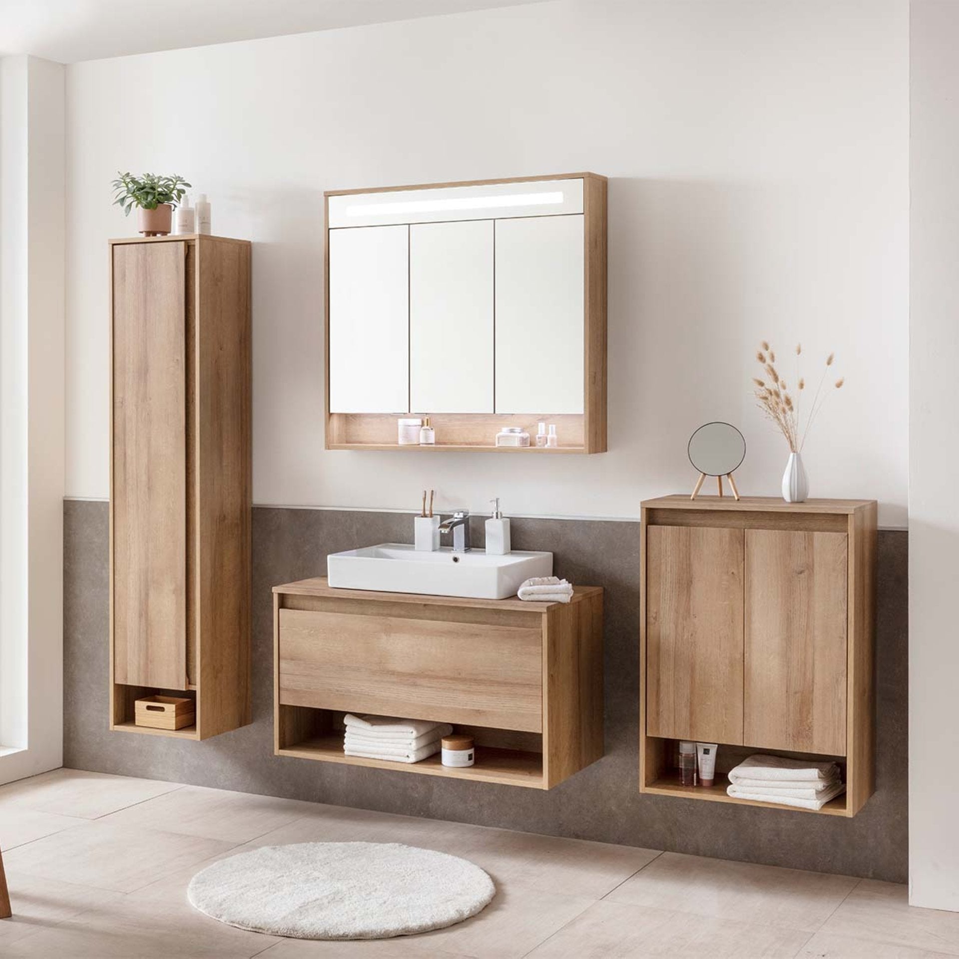 A fogantyú nélküli fürdőszobabútor közvetlenül a vonzó külsőre vonzza a tekintetet. A szemet a front meleg, világosbarna színe gyönyörködteti, ami a tölgyfa mintázata alapján készült.