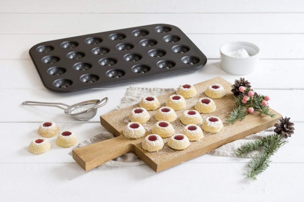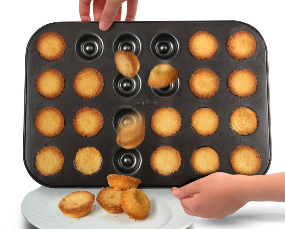 Nincs is más dolga, mint a kész tésztát a süteményforma réseibe kenni, és a sütőforma elvégzi a munkát Ön helyett. Egyetlen sütéssel 24 db tökéletesen formázott aprósütemény az eredmény, így nagyobb mennyiség elkészítése esetén is kiváló választás, hiszen gyorsan tud majd haladni vele. A kész süteményekkel pedig nincs is más dolga, mint megvárni, hogy kicsit kihűljenek majd ízlés szerint lekvárt kanalazhat a közepükbe. Tálalás előtt pedig meghintheti őket egy kis porcukorral, hogy tökéletes íz mellett tökéltes látványt is nyújtsanak.