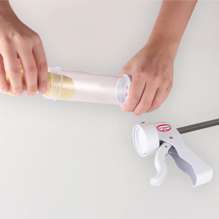 Készítsen el egy tetszőleges vaníliás vagy kakaós tészta receptet, majd töltse a sütemény kinyomó átlátszó tésztatartó részébe.