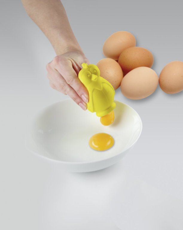 A szilikon csibét összenyomva vákum alakul ki, mivel a tojás sárgáját kiemelhetjük a fehérjéből