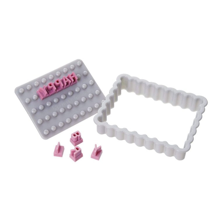 3 részes süteménykiszúró készlet vágó- és betűnyomda bélyegzővel a Zenkertől egyedi üzenetekhez sütire és fondantra Dekorációs készlet 1 kivágóból, 1 dombornyomó bélyegzőből és összesen 90 betűből, számból és speciális karakterből Élelmiszerbiztonsági műanyagból készült Friss Frozen Rose & Cool Grey színben Mosogatógépben mosható vagy könnyen tisztítható kézzel
