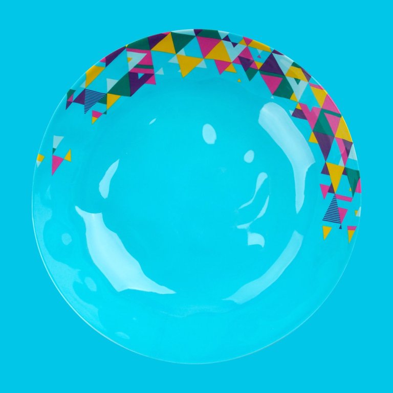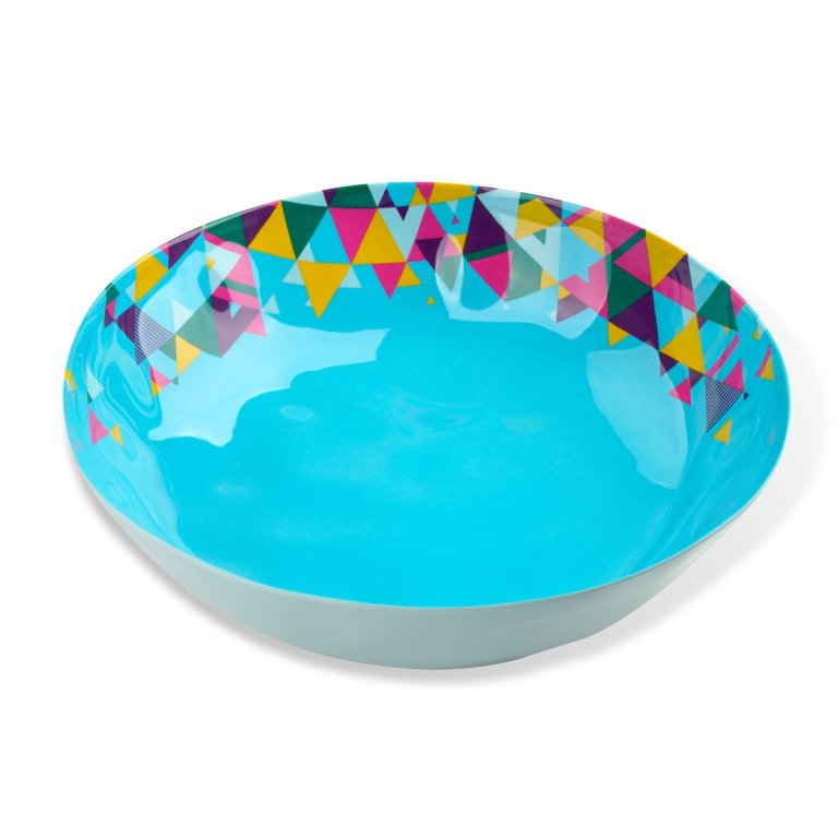 Masszív melaminból készült salátástál kék színben modern színes mintával - méretei Ø 30,5 x 8 cm