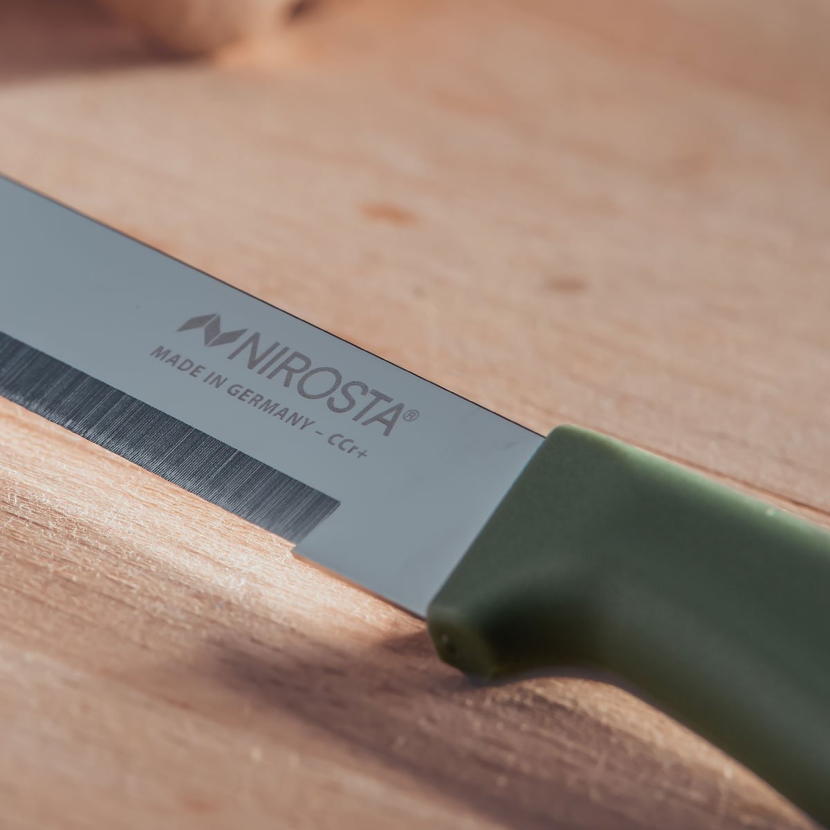 Sokoldalú, univerzális kés a Nirostától zöldségek, sajtok és gyümölcsök vágásához. Extra éles, sima penge kiváló minőségű acélból a könnyű kezelhetőség érdekében. Csúszásmentes nyél fenntartható anyagból a tökéletes fogásért vágás közben. A kés nagyon éles rozsdamentes acél pengével és zöld műanyag nyéllel rendelkezik. Teljes hossza 22,5 cm, pengehossz 11,5 cm. Könnyen kézzel tisztítható és Németországban készült.