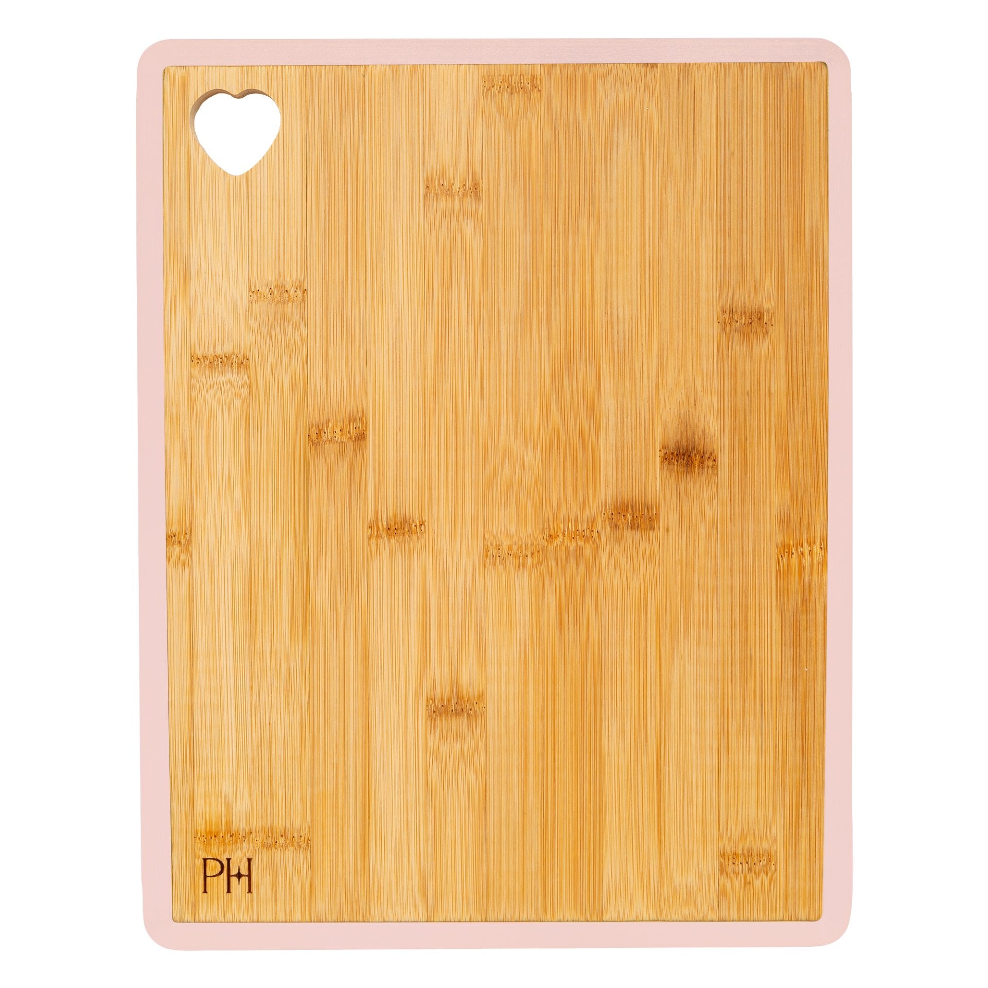 - Bambusz vágódeszka rózsaszín szegéllyel és szív alakú kivágással – méretek 35,5 x 28 x 2 cm