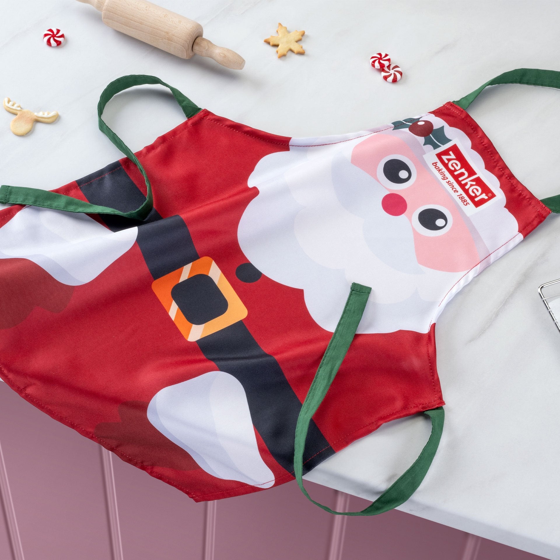Ünnepi gyerekkötény "The Christmas Candy Shop" a Zenkertől Mikulás mintával – tökéletes kis pékeknek és szakácsoknak sütik sütéséhez vagy főzéshez.
