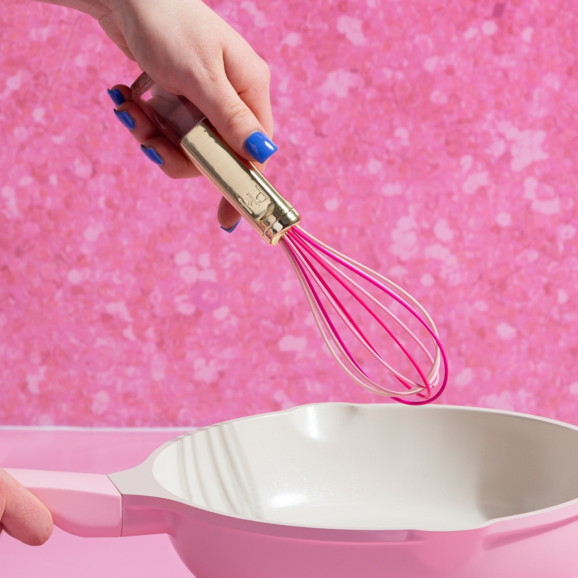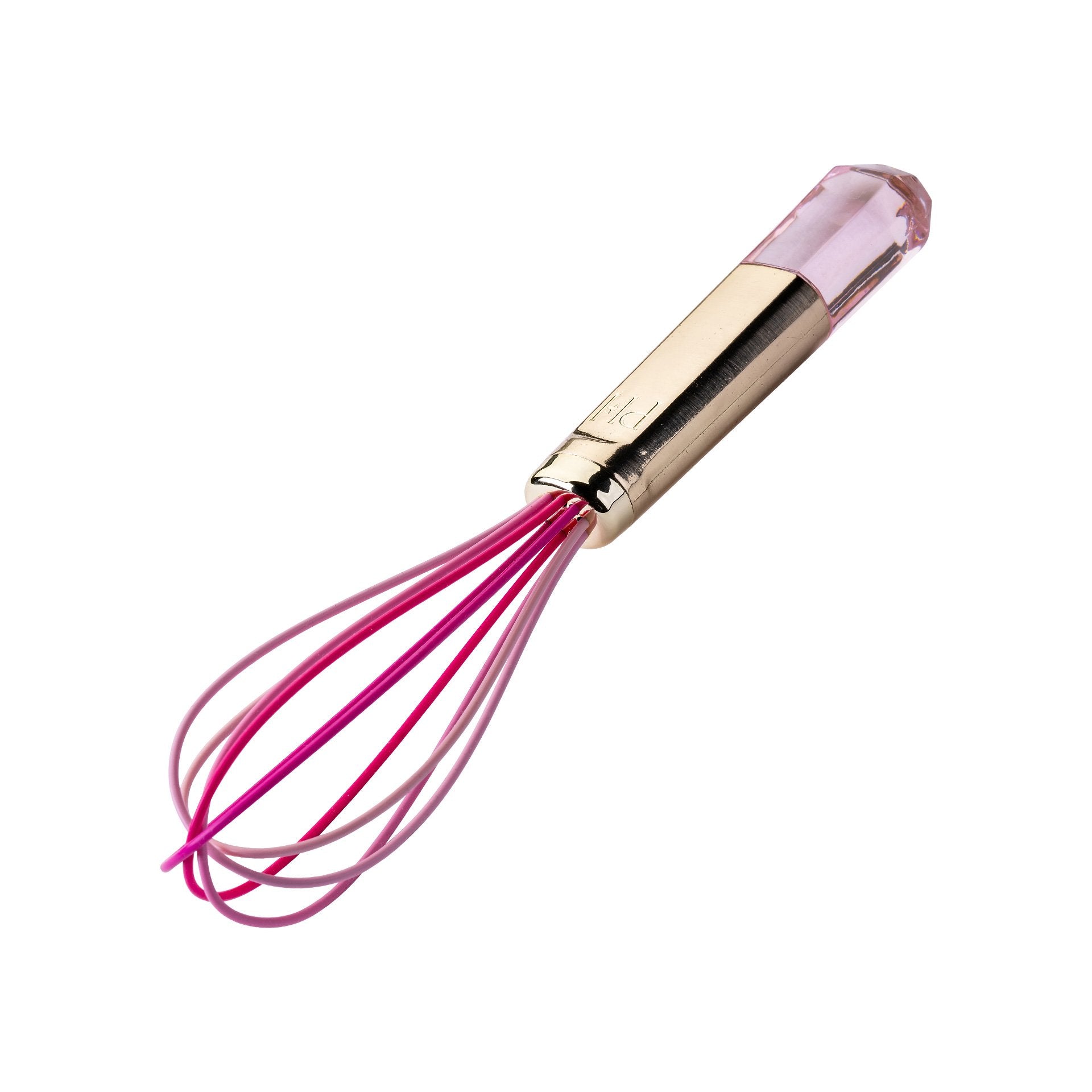 PARIS HILTON Habverő gyémántmintás nyéllel – elegáns konyhai eszköz, amely stílust és funkcionalitást egyesít. Lenyűgöző arany és rózsaszín dizájn, gyémánt alakú nyéllel, amely ergonomikus fogást biztosít. Szorosan fonott rozsdamentes acél és szilikon szálak garantálják a hatékony habverést süteménytésztához, tejszínhabhoz és finom rántottához. Kompakt mérete (24,5 x 5 x 5 cm) praktikus tárolást tesz lehetővé, mosogatógépben mosható. Tökéletes választás azoknak, akik a minőséget és az esztétikát egyaránt értékelik.