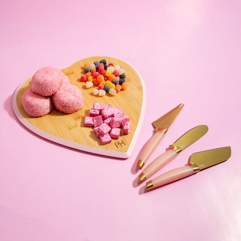 Stílusos szív alakú bambusz vágódeszka rózsaszín szegéllyel – méretei 35,5 x 28 x 2 cm