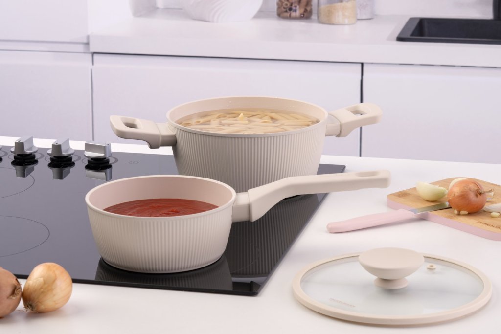 - Újrahasznosított alumíniumból készült, PFAS-mentes kerámia tapadásmentes bevonattal a könnyű főzés érdekében