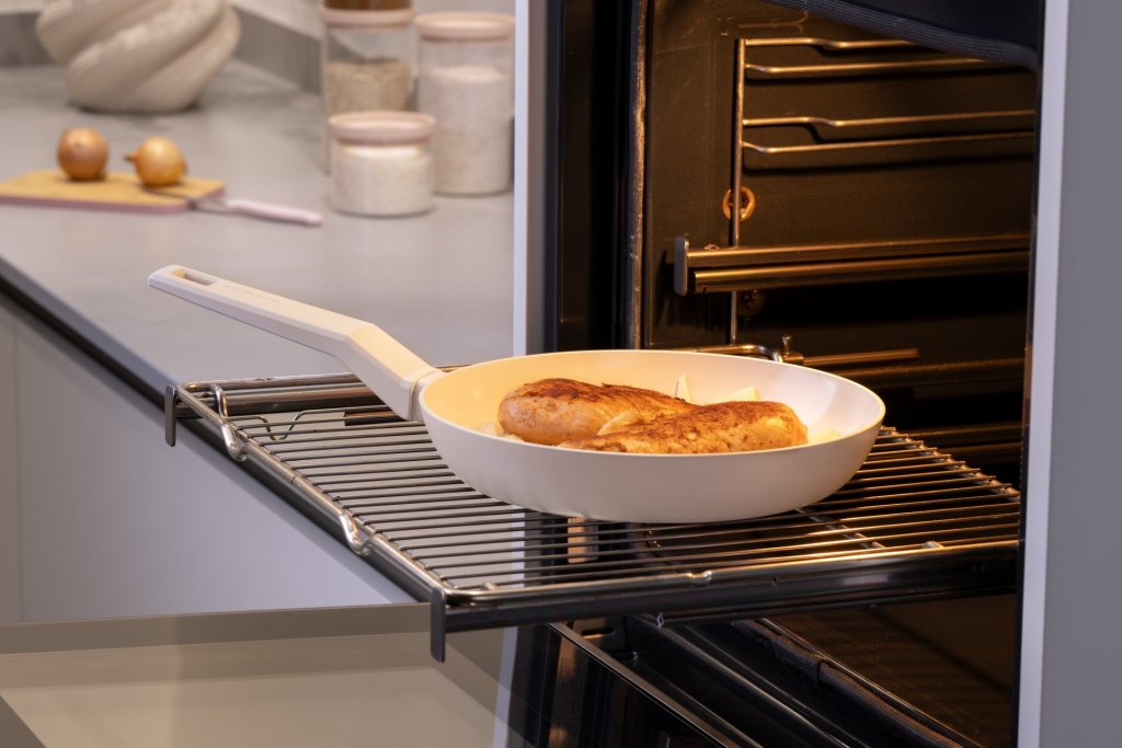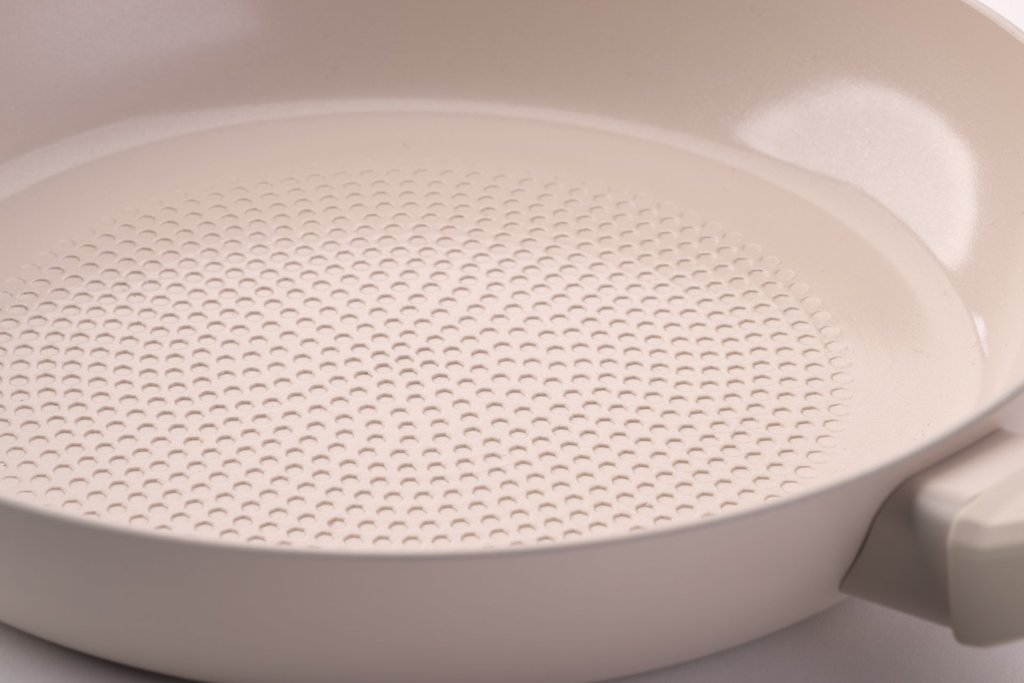 - A PFAS-mentes kerámia tapadásmentes bevonat megakadályozza az odaégést és lehetővé teszi az alacsony zsírtartalmú sütést.