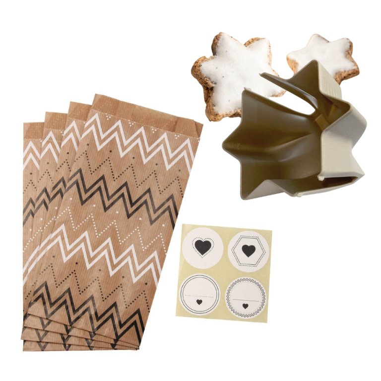 - A szett tartalma: csillag alakú süteménykiszúró + 4 db papír ajándék zacskó matricával