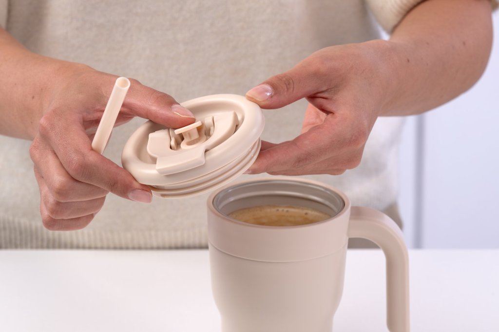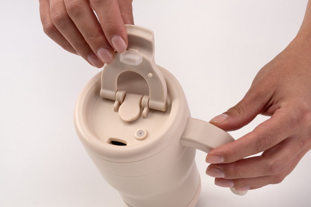 - A bögre dugóval ellátott szívószállal és külön nyílással rendelkezik – ideális vízhez, kávéhoz vagy teához